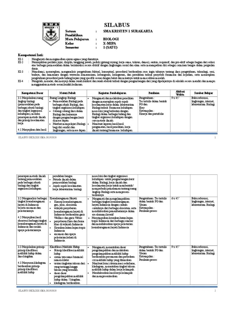 Silabus merupakan penjabaran standar kompetensi dan kompetensi dasar ke dalam materi pokok/ pembelajaran, kegiatan pembelajaran, dan indikator pencapian kompetensi untuk penilaian. 88%(8)88% found this document useful (8 votes). Soal uas biologi kelas 10 semester 1. Demikian silabus biologi kelas x sma dan smk kurikulum 2013 tahun 2020/2021 semoga bermanfaat khusunya untuk saya danbapak ibu guru yang membutuhkan prangkat pembelajaran ini. Demikianlah rpp biologi 1 lembarhalaman kelas 10 x jenjang smama semester 1 ganjil dan semester 2 genap kurikulum 2013 revisi terbaru yang dapat kami bagikan semoga bermanfaat.